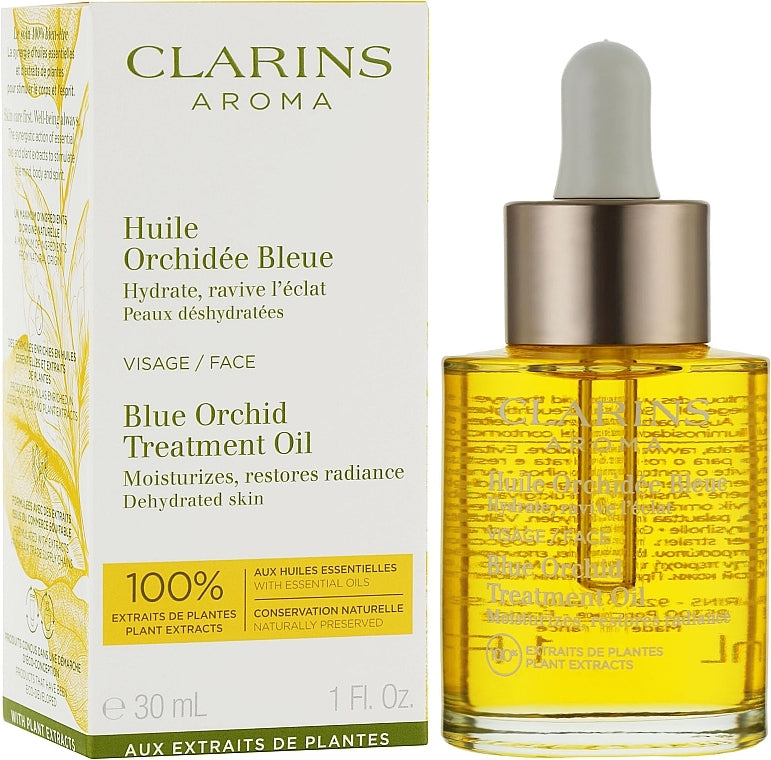 L'olio viso per pelle disidratata Clarins Blue Orchid Face Treatment Oil è un trattamento profumato che nutre, rivitalizza la pelle, grazie ai suoi oli essenziali, legno di rosa, patchouli e l'estratto di orchidea. La "meraviglia" per la pelle disidratata, ha il 100% di estratti puri di piante. Gli oli essenziali aromatici di legno, di rosa, rivitalizza e tonifica l'epidermide, il patchouli e gli estratti di orchidea, nutrono e ammorbidiscono la pelle. Clarins Blue Orchid Face Treatment Oil possiede la consistenza abbastanza liquida e leggera, che viene assorbita rapidamente, senza lasciare alcuna sensazione di grasso.